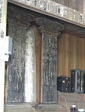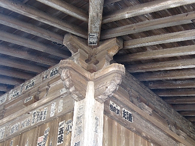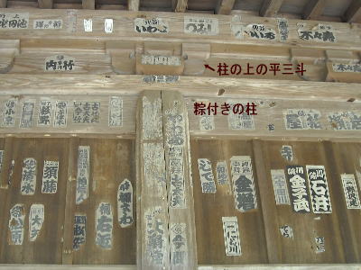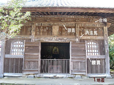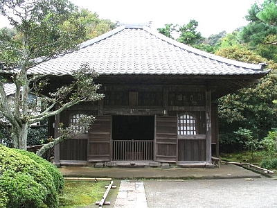 仏殿 (薬師堂) について仏殿は、桁行三間 (約6.4メートル)、梁間三間で、安永六年 (1777) に浄智寺の仏殿であったものが移築されたもので、そもそもの建築は慶安二年ではないかという推定もあります。正面中央は、桟唐戸両開きで、その両外側には花頭窓がつきます。 外回りは、地覆、腰貫、内法貫、頭貫、台輪を配します。 柱は角柱で、四隅に切込みが入り、上部には粽がつきます。柱の上の組物は、平三斗で、正面は中備えを2組、両外側は1組を配します。 |