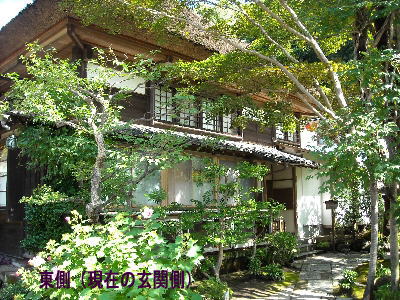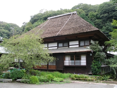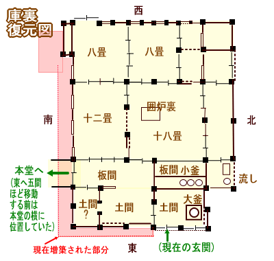 (『鎌倉市文化財総合目録 建造物編』より作成) 庫裏は、五間ほど西 (境内の奥の方向) にあり、本堂の向かって右に並ぶように立っていたものを、関東大震災後現在の位置に移したとのことです。 現在の玄関(東)側は土間や台所で、かまどや流しがありました。 奥に田の字型に4つの部屋などがありますが、およその配置は現在も保たれているようです。 |