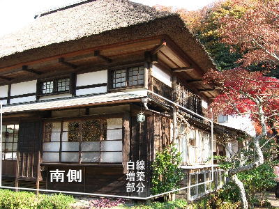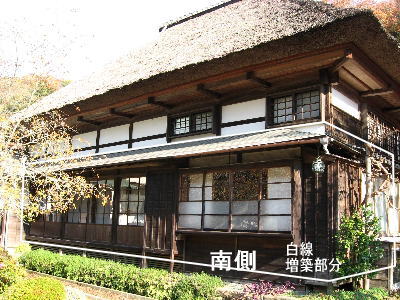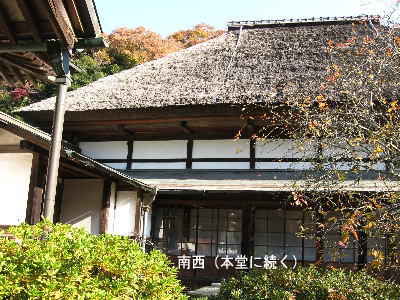 庫裏について桁行き七間半、梁間五間の寄棟造りの茅葺で、天明五年 (1785) のものです。特徴は、出し桁 (だしげた) 造りで、軒下に横木を長く出し、その上に長い桁を渡し、屋根の一番下の外側を支えます。 中二階があります。東側(現在の玄関のある面)や南側(本堂前の広場に面する面)の一階部分に増築された部分があるなど、かなり改築されてはいますが、それでも昔の姿をよく伝えているといわれます。