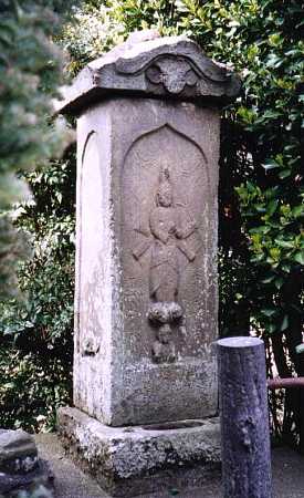 中心に合掌六手の青面金剛を刻み、下にー猿が正面を向いて彫られています。